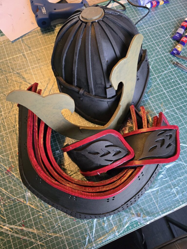 With clear instruction videos also provided by SKS Props on YouTube, it was very easy for a first attempt with foam to build up. This was stuck together with hot glue, and once dried, was then primed over in jet black. Then to add special details, the other colours used were Red and Gold.