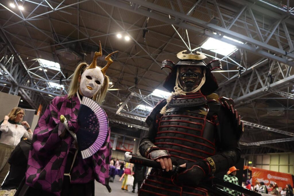 Ducky was not orignally going to be dressed up because she wanted me to be the main star. However, i sewed for her a Hakama and had her come with me as a Samurai Warrior lady. Here is the both of us together with her homemade mask, prop sword and fan.